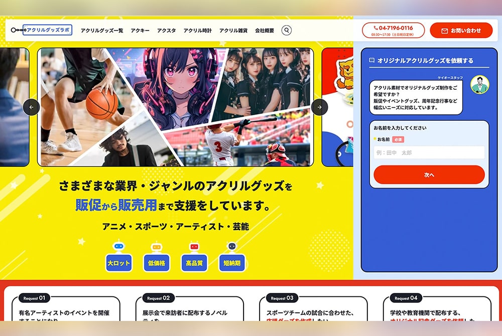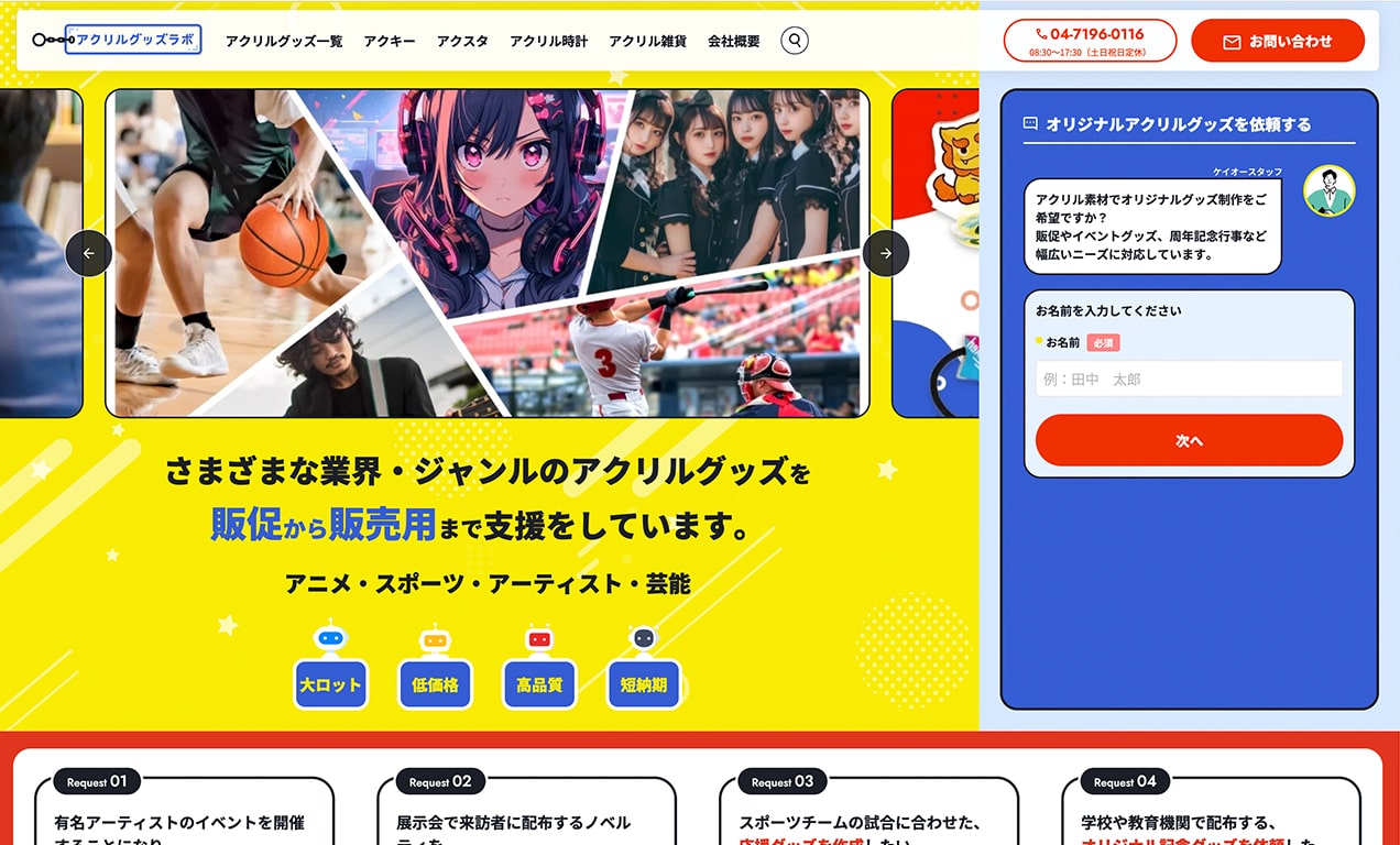 アクリルグッズをオリジナルで制作したい法人・個人の方へ。販促物、イベント記念品、販売グッズなど、多彩な用途に対応する高品質アクリルグッズを短納期でご提供します。