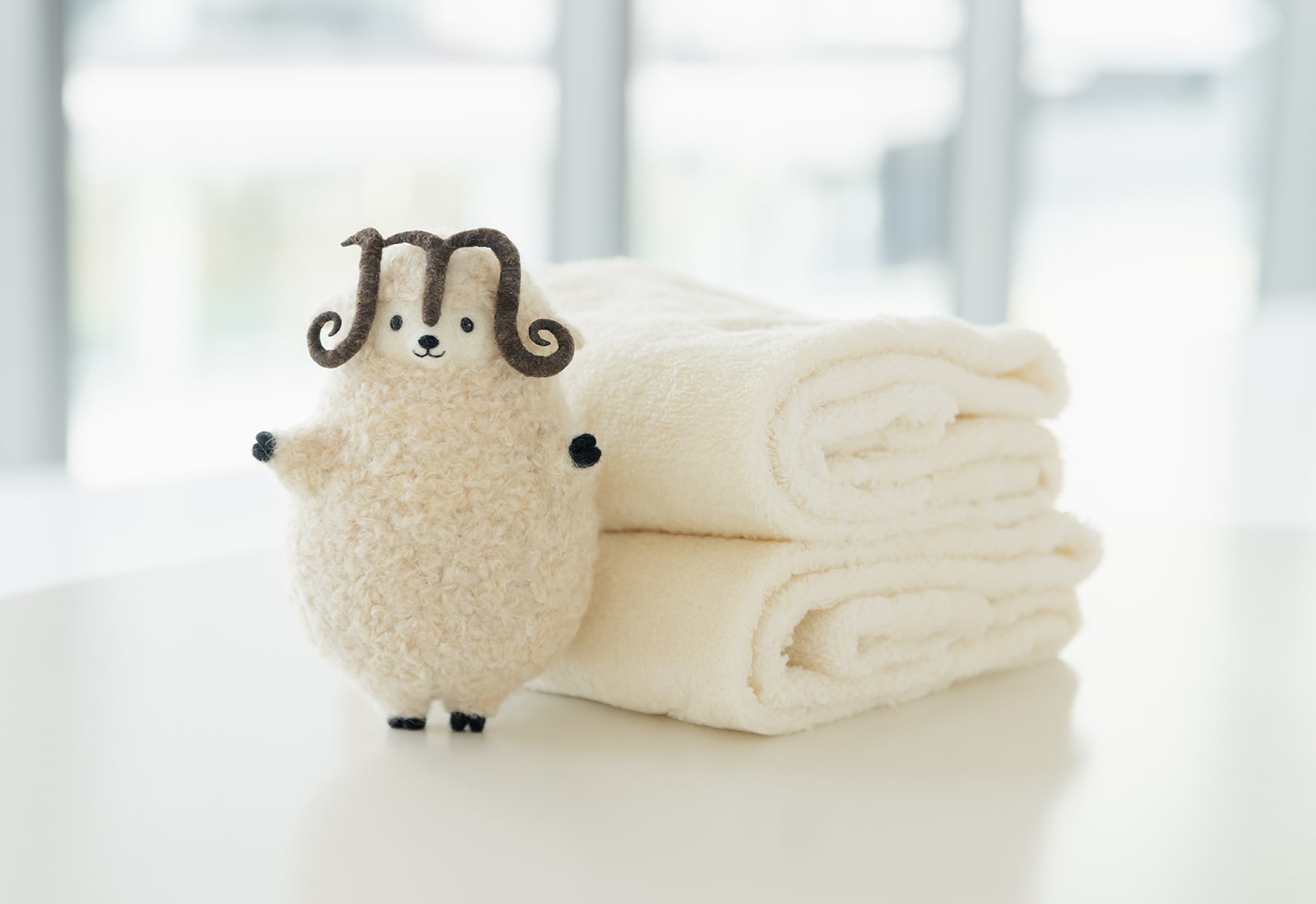 メリポくんの使命は、フェリシモでのお買い物をもっと楽しくすること。ひつじの妖精 メリポくんの、フワフワ、もこもこの手触りや質感を表現した「メリポくんタオル」